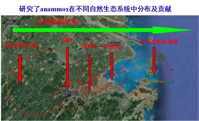 鄭平教授以前的學生--浙江大學胡寶蘭教授研究了Anammox細菌在中國不同自然生態(tài)系統(tǒng)中的分布及貢獻。她發(fā)現(xiàn),Anammox細菌廣泛存在于不同的自然生境中,且沉積物的有機碳和無機氮是影響Anammox分布的主要因素。她還發(fā)現(xiàn)人類活動影響了Anammox菌的分布,甚至特定Anammox菌可作為人類活動的指示菌。