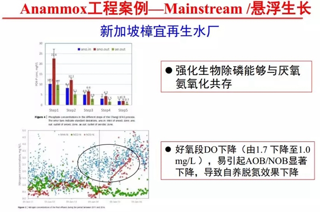 除了污泥消化液、工業(yè)廢水,近五年全球擴大了對Anammox在城市污水主流程中的應用。新加坡樟宜再生水廠是新加坡最大的再生水廠,也是國際上首個強化生物除磷與厭氧氨氧化在大型污水廠共存的案例。短污泥齡和適宜溶解氧是實現(xiàn)懸浮游離厭氧氨氧化菌生長的必要條件,在好氧區(qū)實現(xiàn)部分硝化和亞硝酸鹽積累,缺氧區(qū)進行厭氧氨氧化反應(脫氮貢獻率30%),整體工藝能耗降低10%-30%,池容減少10%-40%。新加坡公用事業(yè)局的科學家曹業(yè)始博士在該污水廠Anammox技術的設計和應用中發(fā)揮了重要作用。