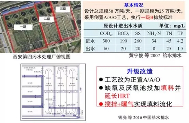 西安第四污水處理廠設計總規(guī)模50 萬噸/天,一期規(guī)模為25 萬噸/天,采用倒置A/A/O工藝,執(zhí)行一級B排放標準,后經升級,改造為正置A/A/O工藝,在缺氧及厭氧池投加填料并延長HRT,通過攪拌+曝氣實現(xiàn)填料流化,出水水質成功由一級B提升為一級A標準。