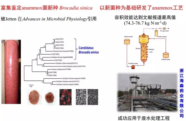 鄭平教授團隊改進的Anammox工藝容積效能達到文獻報道最高值(74.3~76.7kg N·m-3·d),并成功應用于浙江的海森藥業(yè)有限公司廢水處理工程,這是中國第一個厭氧氨氧化廢水處理的實際工程。