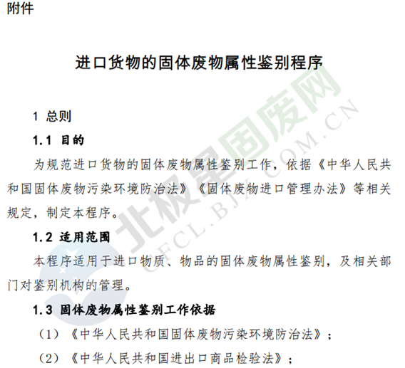 為貫徹《中華人民共和國固體廢物污染環(huán)境防治法》和《固體廢物進口管理辦法》,加強進口固體廢物的環(huán)境管理,規(guī)范進口貨物的固體廢物屬性鑒別工作,現(xiàn)發(fā)布《進口貨物的固體廢物屬性鑒別程序》(見附件)。