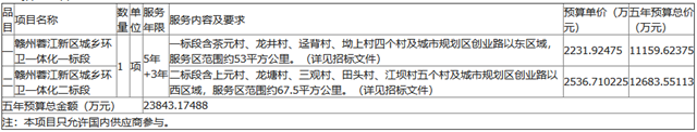 江西省贛州蓉江新區(qū)城鄉(xiāng)環(huán)衛(wèi)一體化項目發(fā)布中標結(jié)果公告,龍馬環(huán)衛(wèi)和中聯(lián)環(huán)境分獲一、二標段。其中,一標段中標金額達1.08億,二標段中標金額達1.15億,項目總金額達2.23億。