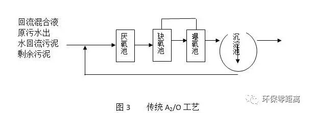 A2- O 法處理工藝是在好氧條件下,污水中NH3和銨鹽在硝化菌的作用下被氧化成NO2-—N和NO3-—N,然后在缺氧條件下,通過反硝化反應(yīng)將NO2-—N和NO3-—N還原成N2,達(dá)到脫氮的目的。A2/O是目前普遍采用的工藝,它是在法A/O法的基礎(chǔ)上增加一個(gè)厭氧段和一個(gè)缺氧段,傳統(tǒng)A2/O工藝流程如圖3所示。