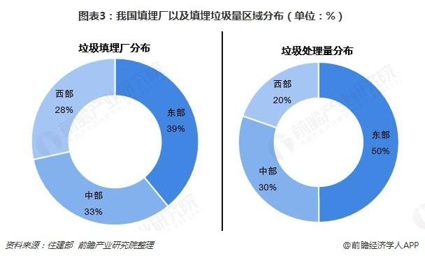 我國垃圾填埋廠分布較為均勻,整體來看東部垃圾廠比中部多40多座,比西部多70多座。在垃圾填埋廠數(shù)量上,東部占39%,中部占33%,西部占28%。但從垃圾填埋量來看,東部地區(qū)占據(jù)全國垃圾填埋量的一半份額,垃圾填埋處理能力較強(qiáng)。
