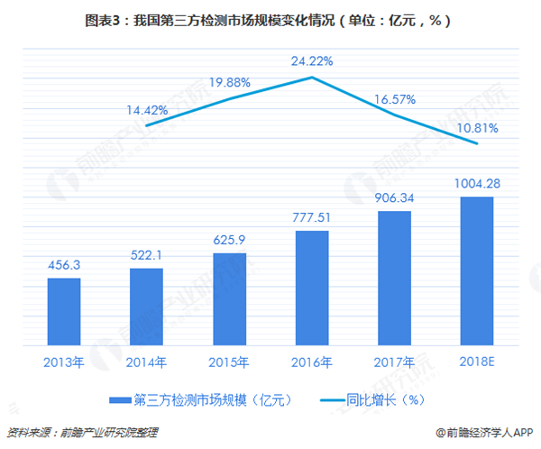 根據(jù)前瞻產(chǎn)業(yè)研究院發(fā)布的《中國(guó)第三方檢測(cè)行業(yè)發(fā)展趨勢(shì)與投資決策支持研究報(bào)告》數(shù)據(jù)顯示,2017年我過(guò)第三方檢測(cè)市場(chǎng)規(guī)模在900億元左右,近年來(lái)維持在10%以上的較高增速。預(yù)計(jì)2018全年第三方檢測(cè)市場(chǎng)規(guī)模將突破千億元大關(guān),我國(guó)第三方檢測(cè)市場(chǎng)將達(dá)到新的高度。