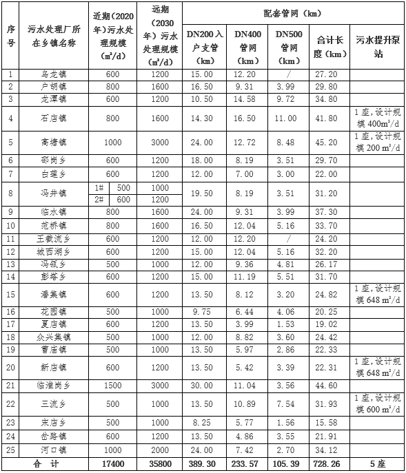 (1)新建污水處理廠26座,規(guī)劃近期(至2020年)的污水處理總設(shè)計規(guī)模約1.74萬m3/d【遠期(至2030年)約3.58萬m3/d,本次實施僅考慮近期】;