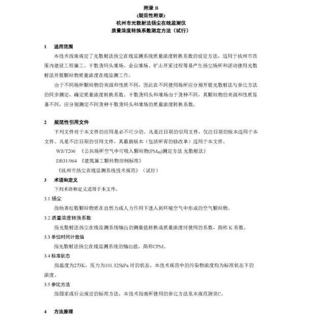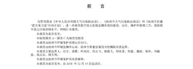 為貫徹落實國務院《打贏藍天保衛(wèi)戰(zhàn)三年行動計劃》和《杭州市“清潔排放區(qū)”建設暨大氣污染防治2018年實施計劃》加強揚塵監(jiān)管,安裝在線監(jiān)測和視頻監(jiān)控設備的工作要求,規(guī)范我市揚塵在線監(jiān)測系統(tǒng)的建設、維護和管理工作,進一步提高我市揚塵污染防治水平。杭州市環(huán)境監(jiān)測中心站和杭州市質(zhì)量技術(shù)監(jiān)督檢測院經(jīng)過廣泛調(diào)研,結(jié)合我市實際,編制完成了《杭州市揚塵在線監(jiān)測系統(tǒng)技術(shù)規(guī)范(試行)》,并在征求相關(guān)部門意見的基礎上,已進行修改完善,現(xiàn)予以發(fā)布。