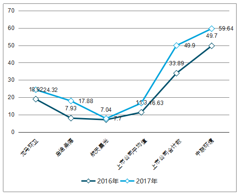 (1)2017 年共有 4,632 家企業(yè)中標環(huán)衛(wèi)項目,同比增長 43.23%。新簽環(huán)衛(wèi)服務合同總金額為 1,701 億元,同比增長 97.56%平均合同金額為 0.2143 億元,同比增長 23.66%。新簽項目的首年金額為314 億元,同比增長 40.18%,平均首年金額為 0.0359 億元,同比下降20.58%。
