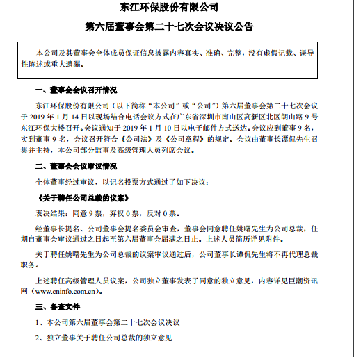 企業(yè)公告丨東江環(huán)保董事會(huì)同意聘任姚曙為公司總裁