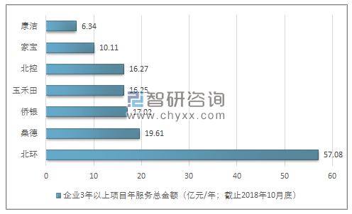 2018年全國環(huán)衛(wèi)領(lǐng)先企業(yè)3年以上項目年服務(wù)總金額情況