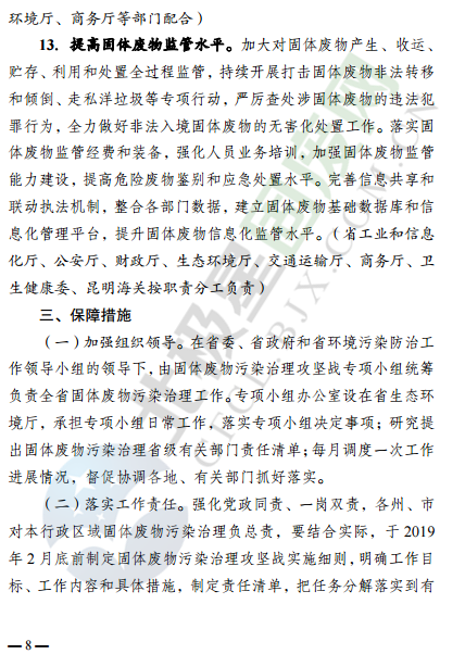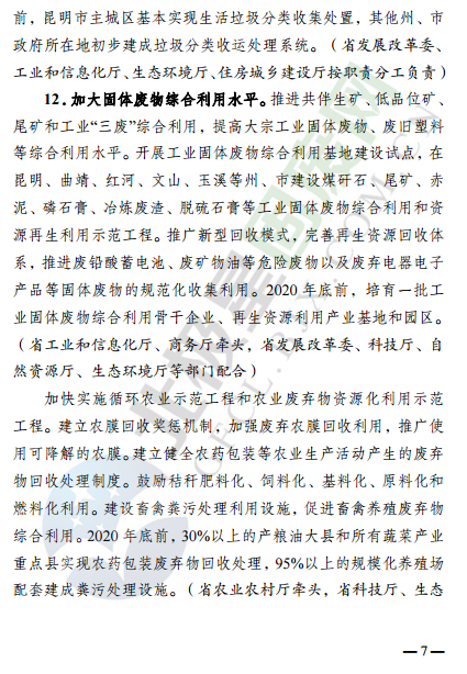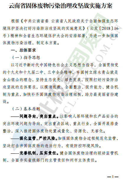 近日,云南省環(huán)境保護(hù)廳發(fā)布了云南省固體廢物污染治理攻堅(jiān)戰(zhàn)實(shí)施方案,針對(duì)固廢處理監(jiān)管、治理重點(diǎn)方向和行業(yè)等提出了明確要求,詳情如下: