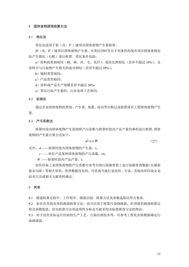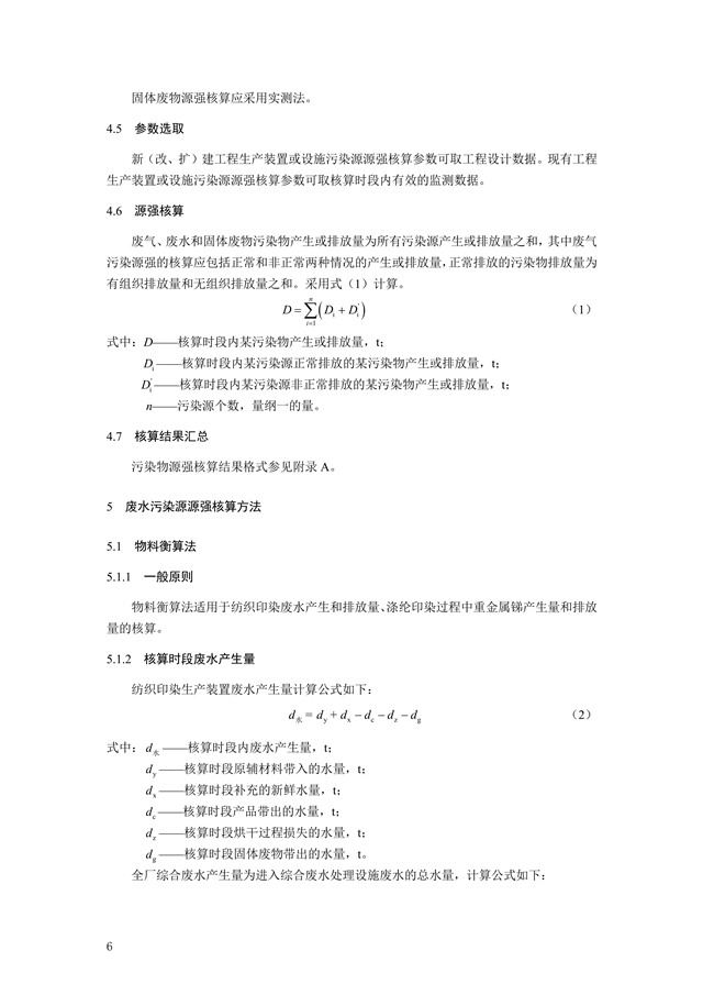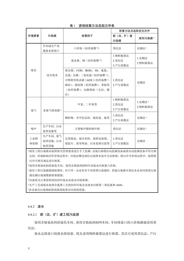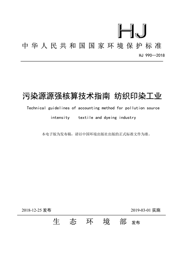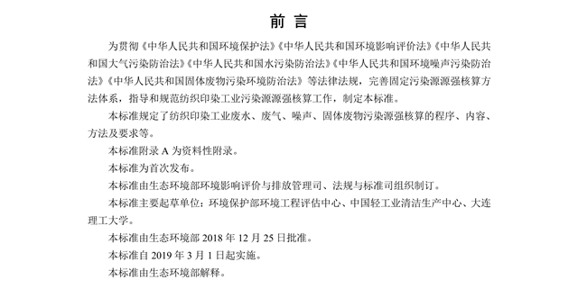 為貫徹《中華人民共和國(guó)環(huán)境保護(hù)法》《中華人民共和國(guó)環(huán)境影響評(píng)價(jià)法》《中華人民共和國(guó)大氣污染防治法》《中華人民共和國(guó)水污染防治法》《中華人民共和國(guó)環(huán)境噪聲污染防治法》《中華人民共和國(guó)固體廢物污染環(huán)境防治法》等法律法規(guī),完善固定污染源源強(qiáng)核算方法體系,指導(dǎo)和規(guī)范紡織印染工業(yè)污染源源強(qiáng)核算工作,制定本標(biāo)準(zhǔn)。本標(biāo)準(zhǔn)規(guī)定了紡織印染工業(yè)廢水、廢氣、噪聲、固體廢物污染源強(qiáng)核算的程序、內(nèi)容、方法及要求等。本標(biāo)準(zhǔn)附錄 A 為資料性附錄。本標(biāo)準(zhǔn)為首次發(fā)布。