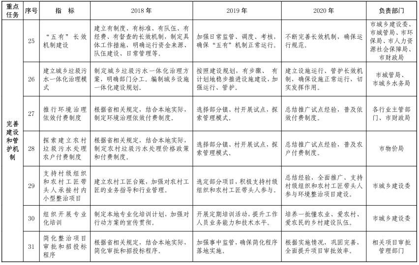 (一)推進農(nóng)村垃圾綜合治理。在實現(xiàn)城鄉(xiāng)環(huán)衛(wèi)一體化全覆蓋的基礎(chǔ)上,推行農(nóng)村生活垃圾收運處理市場化運作、減量化處理、資源化利用、數(shù)字化管理、法制化保障的工作機制,所有村莊實現(xiàn)農(nóng)村生活垃圾無害化處理。