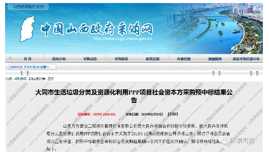 大同市生活垃圾分類資源化利用PPP項目預(yù)中標(biāo)公示: