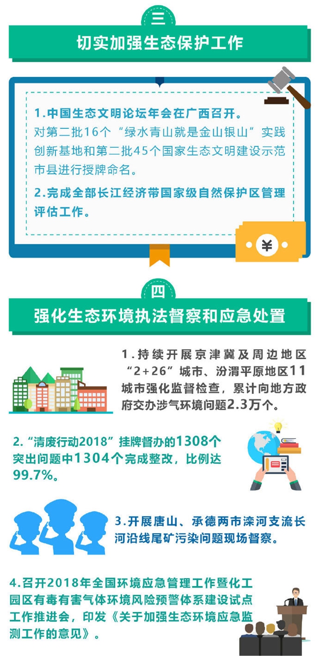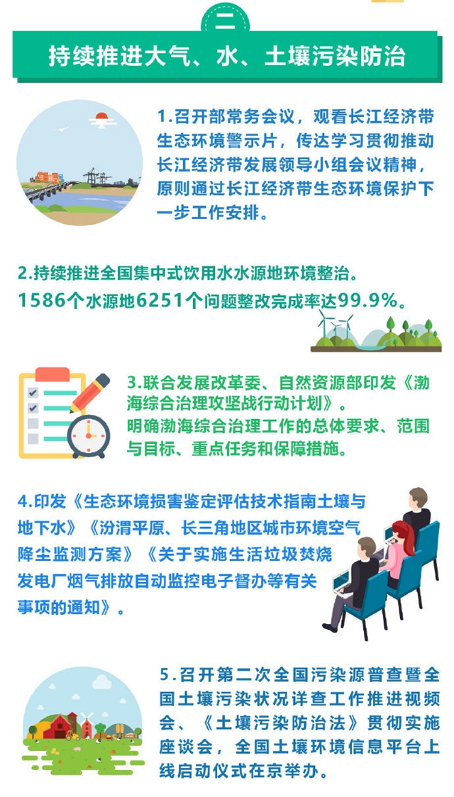 例如:召開全面從嚴(yán)治黨第一次專題會(huì)議,研究近年來(lái)生態(tài)環(huán)境部貫徹落實(shí)中央八項(xiàng)規(guī)定精神情況;持續(xù)推進(jìn)全國(guó)集中式飲用水水源地環(huán)境整治;印發(fā)《生態(tài)環(huán)境損害鑒定評(píng)估技術(shù)指南土壤與地下水》《汾渭平原、長(zhǎng)三角地區(qū)城市環(huán)境空氣降塵監(jiān)測(cè)方案》;召開第二次全國(guó)污染源普查暨全國(guó)土壤污染狀況詳查工作推進(jìn)視頻會(huì);完成全部長(zhǎng)江經(jīng)濟(jì)帶國(guó)家級(jí)自然保護(hù)區(qū)管理評(píng)估工作;“清廢行動(dòng)2018”掛牌督辦的1308個(gè)突出問題中1304個(gè)完成整改,比例達(dá)到99.7%等等。