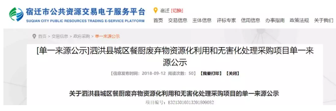 目前(宿城管發(fā)(2018)24號)文件要求,全市餐廚廢棄物處理(PPP)項目已由中國光大國際有限公司中標(biāo)承建,其中二期工程2019年后才能覆蓋到我縣,針對我縣餐廚現(xiàn)狀及城管局核算,運送到市里統(tǒng)一處理成本低(與市區(qū)同價)操作可行。該公司具有該項目環(huán)??萍汲晒b定證書,且省市領(lǐng)導(dǎo)均建議由該公司統(tǒng)一處理全市餐廚廢棄物。故我縣餐廚廢棄物送中國光大國際有限公司(光大環(huán)保餐廚處理宿遷有限公司)處理,符合單一來源要求。