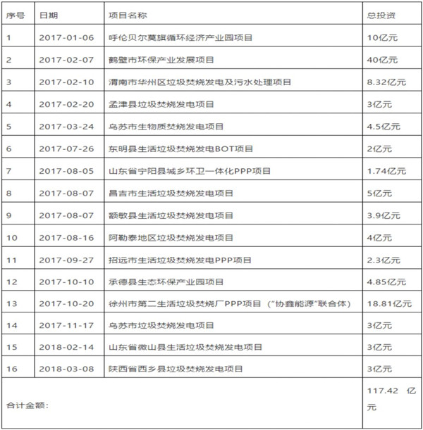 據(jù)統(tǒng)計,2017年至今,盛運環(huán)保或中標(biāo)或簽署了多達(dá)18個項目,其中多數(shù)為垃圾焚燒項目,少數(shù)為污水處理、環(huán)衛(wèi)服務(wù)項目,總投資達(dá)117.42億元人民幣。