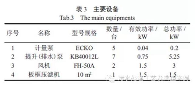 藥劑費:PAC,0.12 kg×1.8 元/kg =0.216 元/t;PAM,0.005 kg×24 元/kg=0.12 元/t;電費:裝機總容量約為10 kW,實際運行約為5 kW,5kW×[0.50 元/(kWh)]/(2 m3/h)=1.25 元;人工費,實際運行時配備2 人(兼職),800 元×2 人/(30 d×20 t)=2.7 元/t。合計4.29 元/t。