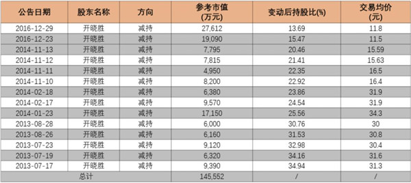 與接連失信相對應的卻是“精準減持”。從2013年7月到2016年年底,開曉勝累計減持了14次,套現(xiàn)總金額約為14.56億元。持股比例從2013年的36.12%,減少到2016年12月28日的13.69%。最后一次減持無限售條件股份0.04%,幾乎清倉。