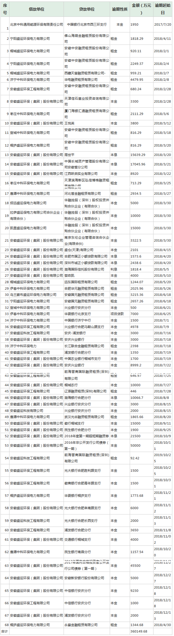 除卻債券違約,盛運環(huán)保還存在大量逾期債務。公司最新發(fā)布的公告顯示,截止2019年1月5日,盛運環(huán)保逾期債務共計68筆,逾期起始日最早2017年7月20日,最晚2018年12月27日,逾期性質(zhì)包括:本金、利息和租金,逾期債務共計36.01億元。