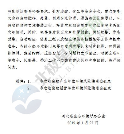 近日,河北省生態(tài)環(huán)境廳發(fā)布了關(guān)于春節(jié)期間加強危險廢物領(lǐng)域環(huán)境風險防控工作的緊急通知,要求加大涉危險廢物領(lǐng)域重點行業(yè)企業(yè)的環(huán)境監(jiān)管力度,2月份,全省暫停實施跨界危險廢物轉(zhuǎn)運,特殊情況必須轉(zhuǎn)移的,一事一報。詳情如下: