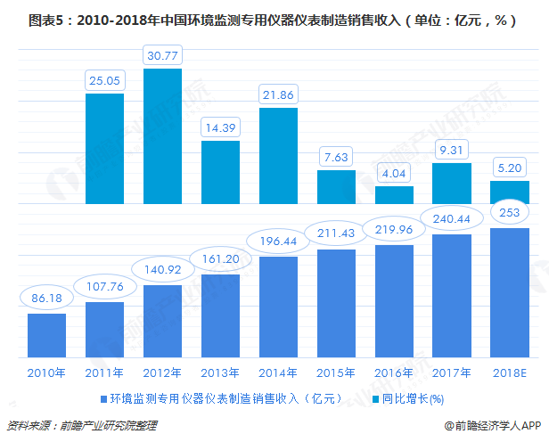 國(guó)家統(tǒng)計(jì)局的統(tǒng)計(jì)數(shù)據(jù)顯示,2017年我國(guó)環(huán)境保護(hù)專用設(shè)備制造業(yè)的銷售收入達(dá)到2780億元左右,其中環(huán)境監(jiān)測(cè)專用儀器儀表制造銷售收入在240億元左右,環(huán)境污染處理專用藥劑材料制造銷售收入在418億元左右。從2010年以來(lái)行業(yè)銷售收入的增速變化可以明顯看出,隨著我國(guó)環(huán)保設(shè)備投放量和保有量的不斷增長(zhǎng),我國(guó)設(shè)備制造銷售增速出現(xiàn)明顯下滑,但整體仍處于上升區(qū)間。