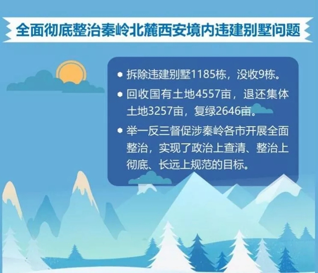 全面徹底整治秦嶺北麓西安境內(nèi)違建別墅問(wèn)題,拆除違建別墅1185棟,沒(méi)收9 棟,回收國(guó)有土地4557畝,退還集體土地3257畝,復(fù)綠2646畝。