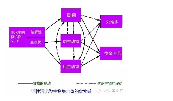 活性污泥中的微生物體主要由各種細(xì)菌和原生動(dòng)物組成,同時(shí)還存在著真菌和以輪蟲為主的后生動(dòng)物。原生動(dòng)物以細(xì)菌為食物,后生動(dòng)物以細(xì)菌和原生動(dòng)物為食物。在活性污泥中的有機(jī)物、細(xì)菌、原生動(dòng)物和后生動(dòng)物構(gòu)成了一個(gè)相對(duì)穩(wěn)定的生態(tài)系統(tǒng)和食物鏈。