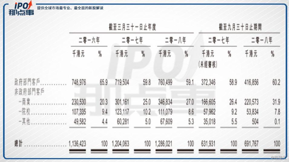 客戶方面,公司主要為政府及非政府部門客戶兩大類。其中,公司的主要業(yè)務(wù)收入是來自政府部門客戶,自2016年至2018年三季度,該部分收入分別約為7.49億港元、7.195億港元、7.605億港元及4.169億港元,相當(dāng)于相應(yīng)期間總收入的約65.9%、59.8%、59.1%及60.2%。