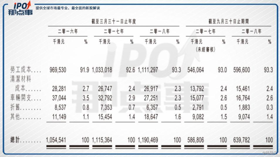 三是勞動(dòng)密集型企業(yè),弊端較明顯。目前公司有逾8000名雇員,其中大部分為營運(yùn)部門的前線工人,因此勞工成本(主要包括薪金及其他勞工福利、強(qiáng)積金供款、雇員福利撥備及人力資源供應(yīng)商成本)是公司服務(wù)成本的最大部分,長期占據(jù)總成本90%以上比例,2018年中期的勞工成本甚至高達(dá)93.3%。
