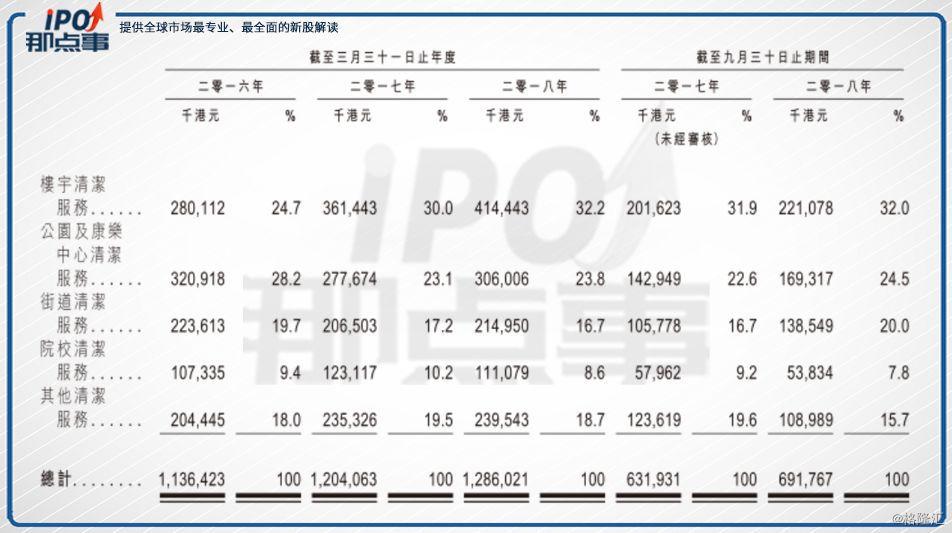 根據(jù)招股書資料,香港的環(huán)衛(wèi)服務(wù)市場(chǎng)從2013年的103.84億港元增長至2017年的143.84億港元,復(fù)合年增長率8.5%,未來預(yù)測(cè)也將按復(fù)合年增長率8.6%增長,樓宇清潔服務(wù)占香港環(huán)境衛(wèi)生服務(wù)市場(chǎng)最大份額,但復(fù)合年增長率也只有8.9%,其他同類業(yè)務(wù)也大概在此區(qū)間。