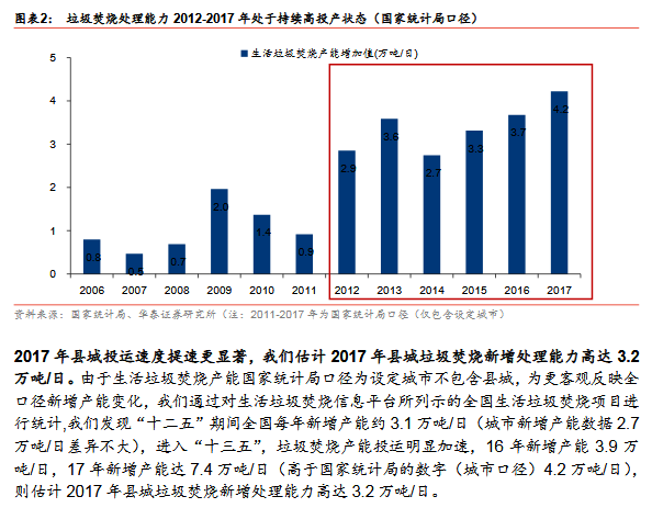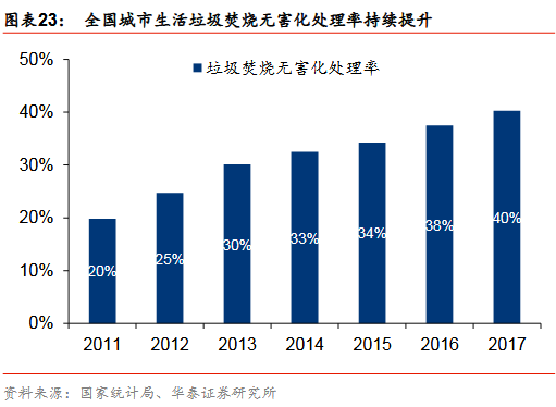 驅(qū)動(dòng)因素一:需求的持續(xù)擴(kuò)張垃圾焚燒發(fā)電行業(yè)持續(xù)擴(kuò)張主要推動(dòng)因素包括:1)垃圾產(chǎn)生量和清運(yùn)量持續(xù)提升:我國(guó)城市垃圾清運(yùn)量由2011年的1.64億噸上升到2017年的2.15億噸,年均復(fù)合增速4.6%,城鎮(zhèn)化的持續(xù)推進(jìn)、生活水平的逐步提高,我們認(rèn)為,城市垃圾產(chǎn)生量和清運(yùn)量仍將保持增長(zhǎng);2)垃圾焚燒占有率快速提升,垃圾焚燒占生活垃圾無(wú)害化處理量的比例從2011年的20%增長(zhǎng)到2017年的40%。