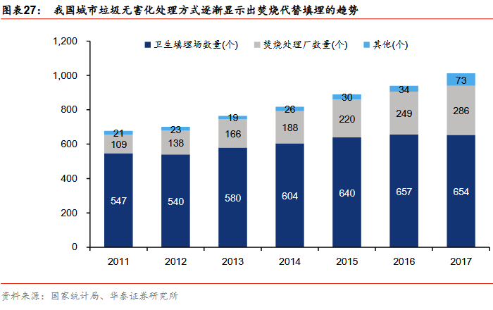 我國(guó)垃圾填埋占比下降,焚燒發(fā)電仍處于成長(zhǎng)期。根據(jù)E20研究院最新統(tǒng)計(jì)數(shù)據(jù),城市垃圾填埋場(chǎng)的規(guī)模逐漸減小,由2008年的622噸/日座降至2016年的533噸/日座,城市生活垃圾處理方式正在由衛(wèi)生填埋向垃圾焚燒發(fā)電轉(zhuǎn)變,填埋場(chǎng)處理對(duì)象從生活垃圾向焚燒殘?jiān)D(zhuǎn)變。
