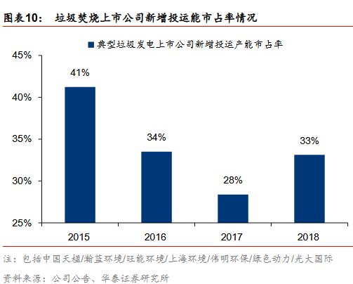 新增訂單趨勢(shì):國(guó)企拿單能力強(qiáng)于民企。我們對(duì)光大國(guó)際、綠色動(dòng)力、瀚藍(lán)環(huán)境、上海環(huán)境、盛運(yùn)環(huán)保、中國(guó)天楹、旺能環(huán)境、偉明環(huán)保幾家典型垃圾發(fā)電上市公司2015-2018年新簽訂單進(jìn)行分析,其中光大國(guó)際、綠色動(dòng)力、瀚藍(lán)環(huán)境、上海環(huán)境四家國(guó)企2015年新簽訂單1.8萬(wàn)噸/日,占8家上市公司新簽訂單總產(chǎn)能的45%,2016年提升至52%、2017年繼續(xù)提升至56%,2018年四家國(guó)企新簽訂單總產(chǎn)能為5.5萬(wàn)噸/日,占比提升至80%,國(guó)企拿單能力顯著強(qiáng)于民企。
