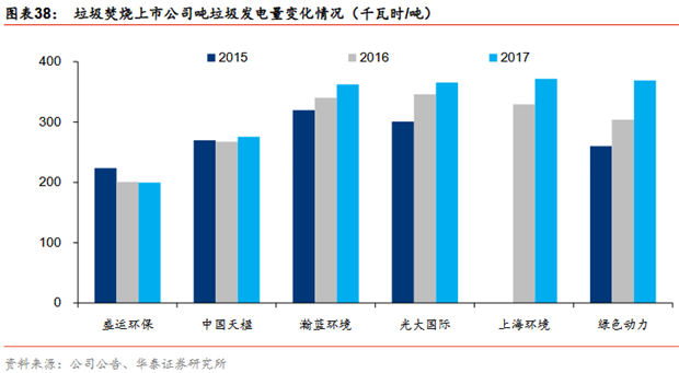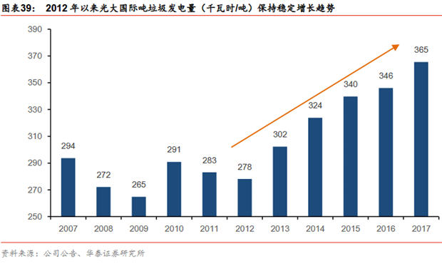 垃圾分類(lèi)+技術(shù)的進(jìn)步=噸垃圾發(fā)電量提升,上市公司層面可以觀(guān)察到幾家典型垃圾發(fā)電企業(yè)在2015-2017年噸垃圾發(fā)電量顯著提升,其中綠色動(dòng)力、光大國(guó)際分別由16年的260千瓦時(shí)/噸、301千瓦時(shí)/噸提升至17年的369千瓦時(shí)/噸、365千瓦時(shí)/噸。長(zhǎng)周期來(lái)看,光大國(guó)際噸垃圾發(fā)電量由2012年的278千瓦時(shí)/噸提升至2017年的365千瓦時(shí)/噸,提升幅度明顯。
