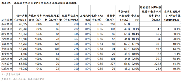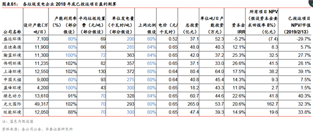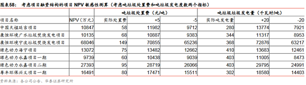 典型項(xiàng)目的NPV考慮項(xiàng)目融資結(jié)構(gòu)的項(xiàng)目NPV測(cè)算:我們假設(shè)項(xiàng)目的資本結(jié)構(gòu)為70%債務(wù),30%自有資金,參考中國(guó)天楹/綠色動(dòng)力的公司財(cái)務(wù)狀況,假設(shè)其項(xiàng)目的債務(wù)資金的綜合成本分別為6.5%/5.6%,各個(gè)項(xiàng)目每年將新增部分財(cái)務(wù)費(fèi)用。依據(jù)之前的投資數(shù)據(jù)和現(xiàn)金流數(shù)據(jù),我們計(jì)算得到各個(gè)項(xiàng)目考慮融資杠桿后的NPV,其中最高的為康恒寧波項(xiàng)目,其N(xiāo)PV為6.8億元,主要是因?yàn)槠鋰嵗幹觅M(fèi)高于其他所有項(xiàng)目,并且噸垃圾發(fā)電量也處于相對(duì)較高水平;而天楹延吉項(xiàng)目、康恒廣水項(xiàng)目、綠色動(dòng)力海寧、綠色動(dòng)力永嘉項(xiàng)目一期的NPV均較低,分別為1.08億元、1.01億元、1.31億元、0.97億元,主要因?yàn)榍皟蓚€(gè)項(xiàng)目的噸垃圾處置費(fèi)和噸垃圾發(fā)電量均較低,而后兩個(gè)項(xiàng)目的噸垃圾處置費(fèi)較低。我們?cè)俅斡?jì)算了各項(xiàng)目的單位產(chǎn)能NPV,發(fā)現(xiàn)天楹延吉項(xiàng)目、康恒廣水項(xiàng)目、綠色動(dòng)力永嘉項(xiàng)目一期的該指標(biāo)分別僅有13.56萬(wàn)元/噸、16.89萬(wàn)元/噸、19.48萬(wàn)元/噸,而康恒寧波項(xiàng)目、綠色動(dòng)力永嘉項(xiàng)目二期、綠色動(dòng)力海寧項(xiàng)目則分別達(dá)到30.24萬(wàn)元/噸、28.83萬(wàn)元/噸、26.14萬(wàn)元/噸,再一次反映了后三個(gè)項(xiàng)目相對(duì)更高的噸垃圾處置費(fèi)和噸垃圾發(fā)電量所帶來(lái)的更高的項(xiàng)目?jī)r(jià)值。根據(jù)我們的敏感性分析,假設(shè)垃圾處置費(fèi)增加5元/噸,各個(gè)垃圾發(fā)電項(xiàng)目的NPV增加410-2809萬(wàn)元;噸垃圾發(fā)電增加20千瓦時(shí)/噸,各個(gè)項(xiàng)目的NPV增加區(qū)間為611-4830萬(wàn)元。我們考慮融資成本和WACC兩個(gè)指標(biāo)再次對(duì)各個(gè)項(xiàng)目的NPV進(jìn)行敏感性分析,發(fā)現(xiàn)融資成本增加0.3pct時(shí), 各個(gè)項(xiàng)目的NPV降低322萬(wàn)元-2120萬(wàn)元;WACC增加0.5pct時(shí),各個(gè)項(xiàng)目的NPV降低789萬(wàn)元-5033萬(wàn)元。