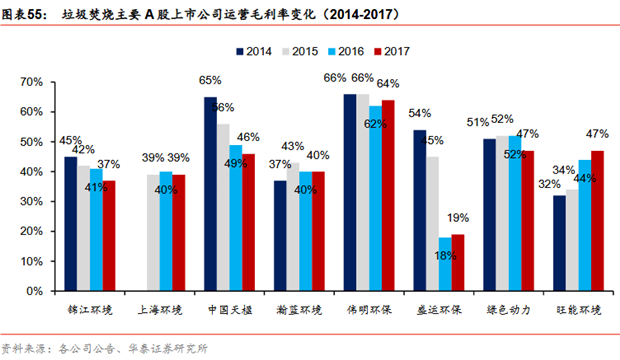 上市公司會(huì)計(jì)政策差異:垃圾焚燒會(huì)計(jì)處理方法各不相同。下面我們選取了行業(yè)里一些主要的上市公司分析,匯總?cè)缦卤?,其中:BOT計(jì)入工程收入的主要有錦江環(huán)境、光大國(guó)際、上海環(huán)境、瀚藍(lán)環(huán)境、盛運(yùn)環(huán)保、綠色動(dòng)力;BOT計(jì)入設(shè)備銷(xiāo)售收入的主要有:光大國(guó)際、中國(guó)天楹、偉明環(huán)保、盛運(yùn)環(huán)保,其中偉明環(huán)保的設(shè)備銷(xiāo)售的毛利率較高,大約在46%左右;各公司的運(yùn)營(yíng)毛利率有一定差異,大部分公司2016年毛利率出現(xiàn)了同比下滑,預(yù)計(jì)由于新投運(yùn)項(xiàng)目的盈利能力不如老項(xiàng)目所致。其中偉明環(huán)保垃圾發(fā)電項(xiàng)目毛利率高出行業(yè)平均較多,主要是因?yàn)樵O(shè)備折舊費(fèi)用少,設(shè)備折舊費(fèi)用可以占到垃圾焚燒成本的40%-50%,而偉明環(huán)保的設(shè)備折舊較少主要有兩點(diǎn)原因:1)偉明環(huán)保自產(chǎn)爐排爐設(shè)備,同時(shí)不計(jì)設(shè)備銷(xiāo)售收入,因此在在建工程確認(rèn)時(shí)并不包含設(shè)備毛利(一般設(shè)備毛利率約40%),因此最終轉(zhuǎn)入無(wú)形資產(chǎn)特許經(jīng)營(yíng)權(quán)的金額比其他公司大約節(jié)省了40%的設(shè)備投資;2)偉明環(huán)保采取的折舊方法是按照特許經(jīng)營(yíng)權(quán)年限折舊,按照2016年特許經(jīng)營(yíng)權(quán)折舊的數(shù)據(jù)估計(jì),綜合折舊年限在25年,折舊年限長(zhǎng)于啟迪桑德、瀚藍(lán)環(huán)境、中國(guó)天楹、光大國(guó)際(這些公司采取特許經(jīng)營(yíng)權(quán)和資產(chǎn)使用年限孰短的方法折舊,一般綜合折舊年限為20年)。