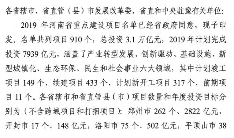 2月11日,河南省發(fā)改委發(fā)布《關于印發(fā)2019年河南省重點建設項目名單的通知》。名單共列項目910個,總投資3.1萬億元,2019年計劃完成投資7939億元,涵蓋了產(chǎn)業(yè)轉(zhuǎn)型發(fā)展、創(chuàng)新驅(qū)動、基礎設施、新型城鎮(zhèn)化、生態(tài)環(huán)保、民生和社會事業(yè)六大領域18個行業(yè)。其中計劃竣工項目149個、續(xù)建項目433個、計劃新開工項目317個、前期項目11個。