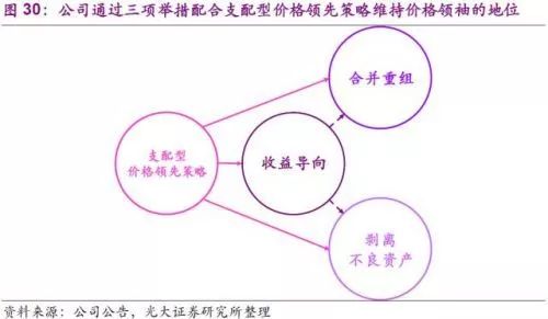 價(jià)格領(lǐng)袖是指經(jīng)由同業(yè)的龍頭公司現(xiàn)行制定產(chǎn)品某一期間內(nèi)的價(jià)格后,其它公司根據(jù)制定的價(jià)格,就其同質(zhì)產(chǎn)品確定其價(jià)格。行業(yè)的競爭對手如果期望維持已有的市場份額,只能與領(lǐng)先公司制定的價(jià)格相匹配。WM在通過兼并收購占據(jù)統(tǒng)治性的市場份額后,利用龍頭地位果斷選擇了支配型價(jià)格領(lǐng)先策略,進(jìn)一步通過“收益導(dǎo)向策略”、“合并重組”、“剝離不良資產(chǎn)”這三項(xiàng)舉措的實(shí)施維持其價(jià)格領(lǐng)袖的地位。