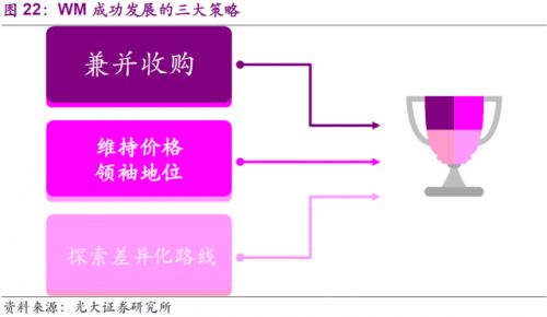 縱觀WM發(fā)展的歷史,它既享受到外部經(jīng)濟(jì)和行業(yè)高速發(fā)展所帶來的廣闊市場,也需經(jīng)歷經(jīng)濟(jì)危機(jī)和市場轉(zhuǎn)型所帶來的陣痛。公司為搶占市場份額,穩(wěn)固龍頭地位,實(shí)現(xiàn)股東最大化方面做出了多方面努力,制定了各類執(zhí)行策略以期達(dá)到目標(biāo),而我們認(rèn)為其中最重要的是三項(xiàng)策略,也是我們將進(jìn)一步細(xì)致分析的,即兼并收購,維持價(jià)格領(lǐng)袖地位,以及探索差異化路線。