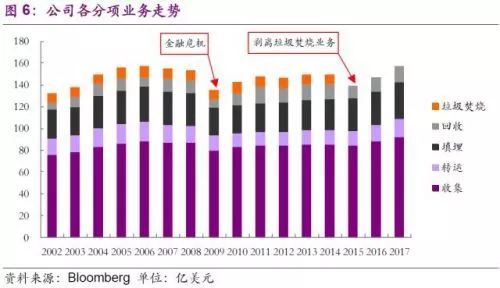 二是收購專業(yè)化的新生業(yè)務(wù)。 隨著固廢傳統(tǒng)市場業(yè)務(wù)趨于飽和,公司也在積極求變。一方面,公司利用自有團(tuán)隊(duì)積極研發(fā)已有業(yè)務(wù)的轉(zhuǎn)型,另一方面,公司先后在2009至2016年,通過多次收購成熟的專業(yè)化新生公司,拓展了醫(yī)廢、有機(jī)垃圾、建筑垃圾、電子回收等市場,并取得了一定成績。需要注意的是,公司的以上收購雖涉及不同細(xì)分領(lǐng)域,但核心觀念一致,即加大資源回收再利用,這也契合美國固廢市場的轉(zhuǎn)型,進(jìn)一步優(yōu)化完善固廢處理全產(chǎn)業(yè)鏈發(fā)展。