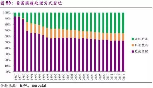 美國在經(jīng)歷了1980—2000年期間大規(guī)模的“去填埋化”后,近年來固廢處理方式較為穩(wěn)定,填埋仍是其主流處理方式,2014年占比近53%,垃圾焚燒和回收利用占比分別為13%和34%。由于垃圾焚燒有著處理成本較高,領(lǐng)避效應(yīng)等不利因素,該處理方式恐較難在美國進(jìn)一步發(fā)展?;厥绽媚壳半m因分揀環(huán)節(jié)成本較高,導(dǎo)致近年來在美國的發(fā)展速度有所放緩,但是我們認(rèn)為,隨著垃圾分類觀念的進(jìn)一步普及,和龍頭企業(yè)市場化力度的進(jìn)一步加大,美國回收利用處理占比有望進(jìn)一步提升。