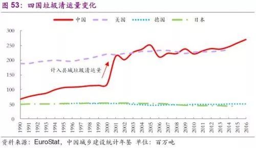 美國、日本、德國同為全球領(lǐng)先的發(fā)達(dá)國家,早在二十世紀(jì)90年代便實(shí)現(xiàn)了100%垃圾清運(yùn)率,所以它們的垃圾產(chǎn)生量也是他們的垃圾清運(yùn)量。美國垃圾清運(yùn)量從二十世紀(jì)90年代起仍在持續(xù)增長,目前維持在2.3億噸左右;德國垃圾清運(yùn)量偶有波動,基本維持在5千萬噸;日本垃圾清運(yùn)量更是從1990年的5千萬噸減少到2015年的4千萬噸左右。中國垃圾清運(yùn)量伴隨著經(jīng)濟(jì)高速發(fā)展,在2001年起計(jì)入縣城垃圾清運(yùn)量后達(dá)到2億噸水平,總量和美國持平并在2012年實(shí)現(xiàn)超越,成為全球垃圾清運(yùn)第一大國。