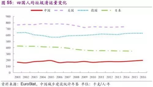年度人均垃圾產(chǎn)生與清運(yùn)量與經(jīng)濟(jì)發(fā)展水平正相關(guān)。美國常年保持在700千克/人?年以上,位居全球之首。德國稍次,近十年恢復(fù)到600千克/人?年水平。日本率先提出3R(減少原料、再利用、資源回收)的固廢處理標(biāo)準(zhǔn)并堅(jiān)持執(zhí)行,近20年來人均垃圾清運(yùn)量已減至300千克/人?年左右。中國雖然總垃圾清運(yùn)量已位居全球第一,但人均垃圾清運(yùn)量距其他三國尚有不小距離,隨著城鎮(zhèn)垃圾清運(yùn)率的進(jìn)一步提升,以及農(nóng)村垃圾產(chǎn)生及清運(yùn)量的進(jìn)一步提升,中國環(huán)衛(wèi)市場存在較大空間。