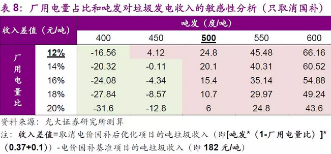 在此情景下,當(dāng)優(yōu)化項(xiàng)目的噸發(fā)達(dá)到500度/噸,或是廠用電量占比低于12%時,便基本可以保證優(yōu)化項(xiàng)目的垃圾焚燒發(fā)電收入可以覆蓋基準(zhǔn)項(xiàng)目電價補(bǔ)貼帶來的額外收入,優(yōu)化項(xiàng)目在無國補(bǔ)情況下仍然可以給公司帶來穩(wěn)定收益。