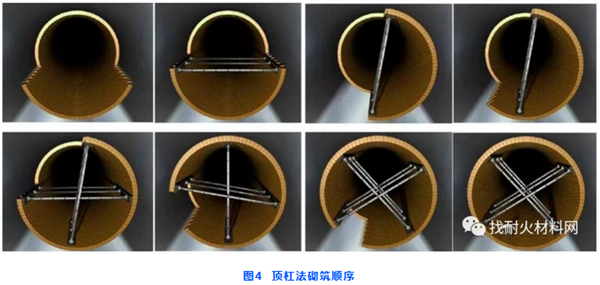 (5)采用頂杠法砌筑時(shí),應(yīng)該從底部同時(shí)向兩側(cè)(圓周方向)均衡進(jìn)行砌筑,超過(guò)半周1~2層磚時(shí),用木方和螺旋頂桿壓實(shí),用適當(dāng)?shù)牧㈨敆U擰緊,防止用力過(guò)大導(dǎo)致窯體變形,每段鋪底長(zhǎng)度,再?gòu)牡撞肯蛩狡鲋簩?shí),砌筑順序如圖4所示,需注意在鎖磚時(shí),需留4~6層磚,并將鎖口區(qū)域旋轉(zhuǎn)至7、8點(diǎn)鐘方向,方便進(jìn)行鎖磚;