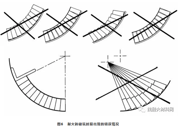 (3)砌筑時(shí)需保證耐火磚貼緊窯體內(nèi)壁,各耐火磚側(cè)面之間(環(huán)向)相互貼緊,隨時(shí)用橡皮錘或木錘敲擊找正來(lái)保證這兩項(xiàng)貼緊;不時(shí)檢查各環(huán)縫是否與環(huán)向基準(zhǔn)線平行,耐火磚的徑向方向線是否與窯體同心,各環(huán)耐火磚間不能存在“臺(tái)階”現(xiàn)象,磚縫不能出現(xiàn)楔形磚縫,如圖6所示: