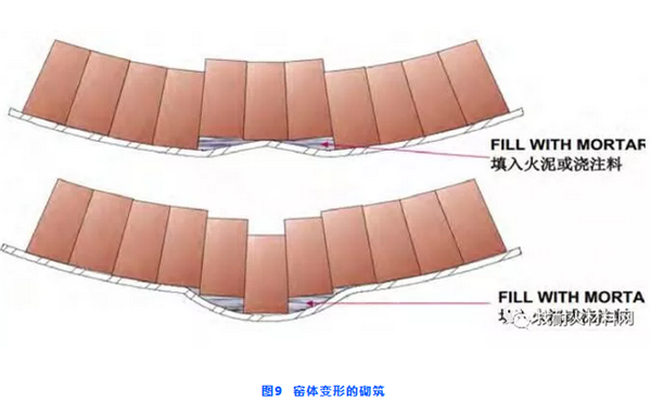 (4) 在焊縫處砌筑時(shí),可以切掉磚角或者用耐火泥漿(火泥)找平來(lái)保證耐火磚與窯體內(nèi)壁貼緊,如圖7、8所示;