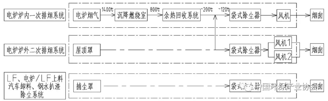 電爐爐內(nèi)排煙經(jīng)余熱鍋爐回收余熱降溫后經(jīng)袋式除塵器除塵達(dá)標(biāo)排放;采用“半密閉導(dǎo)流煙罩+屋頂貯留集塵罩+鐵水溜槽排煙罩”相結(jié)合的方式全過程捕集電爐在加廢鋼、兌鐵水、熔煉、出鋼等過程中產(chǎn)生的排煙,煙氣在半密閉導(dǎo)流煙罩及鐵水溜槽排煙罩導(dǎo)流作用下流經(jīng)屋頂貯留集塵罩,再經(jīng)袋式除塵器除塵達(dá)標(biāo)排放;采用爐內(nèi)一次排煙和爐外移動(dòng)半密閉罩二次排煙相結(jié)合的方式捕集鋼包電弧爐煙氣,經(jīng)袋式除塵器除塵達(dá)標(biāo)排放。
