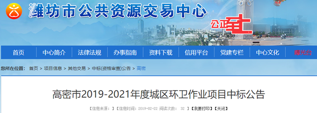 山東濰坊高密市2019-2021年度城區(qū)環(huán)衛(wèi)作業(yè)項目發(fā)布中標公告,昌邑市康潔環(huán)衛(wèi)工程有限公司獲得三標段,中標金額792萬。